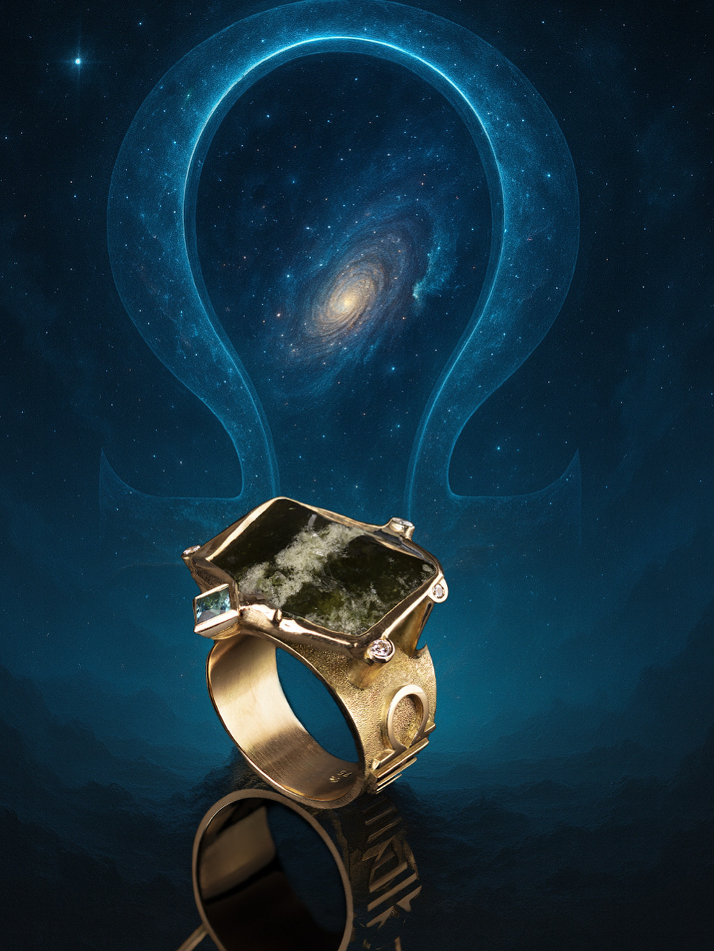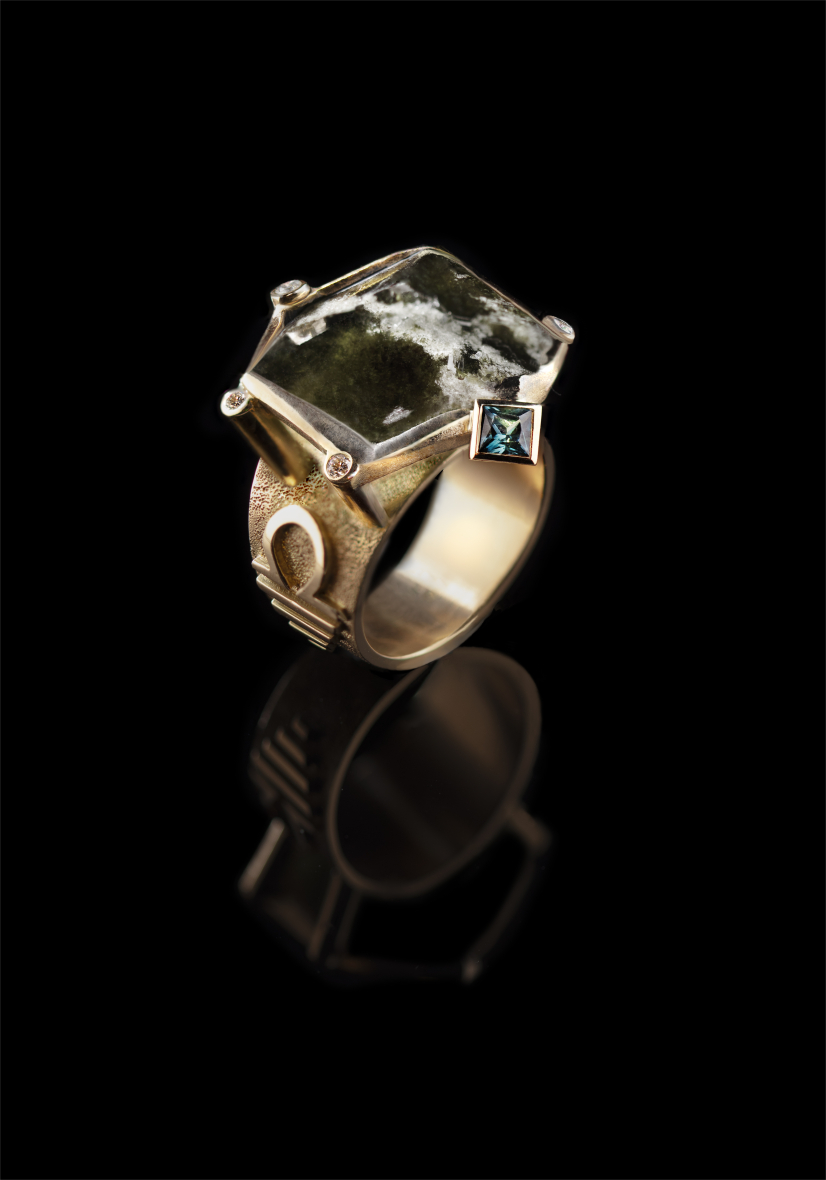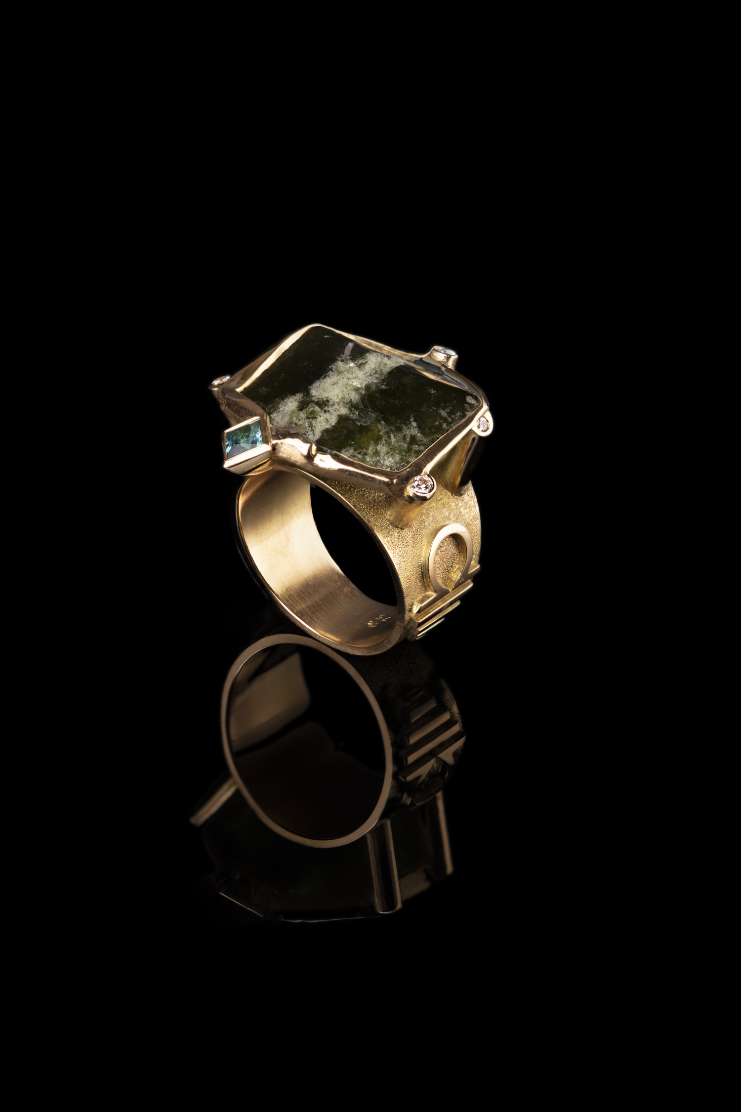 Der OMEGA Ring ist eine Einzelanfertigung aus 750er Gelbgold, einem Uvit, sowie einem Indigolith und lupenreinen Brillanten. Ringgröße 58