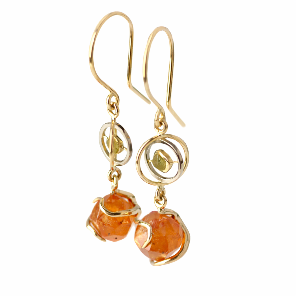 STARSEEDS Ohrringen aus 750er Gold mit gelben Saphirkristalen und Mandaringranatkristallen.