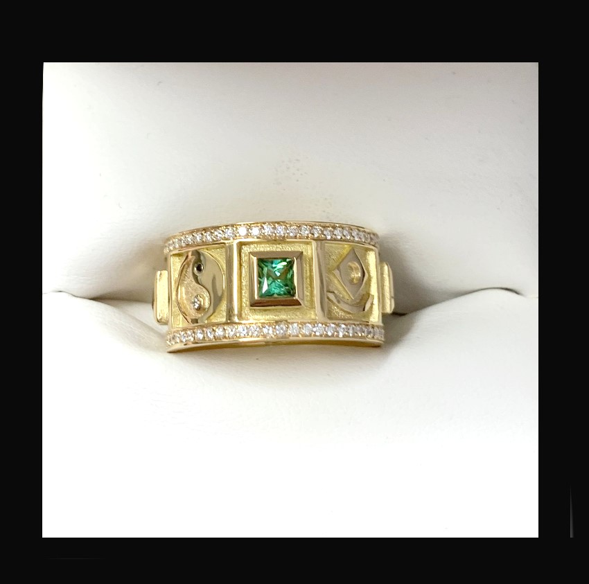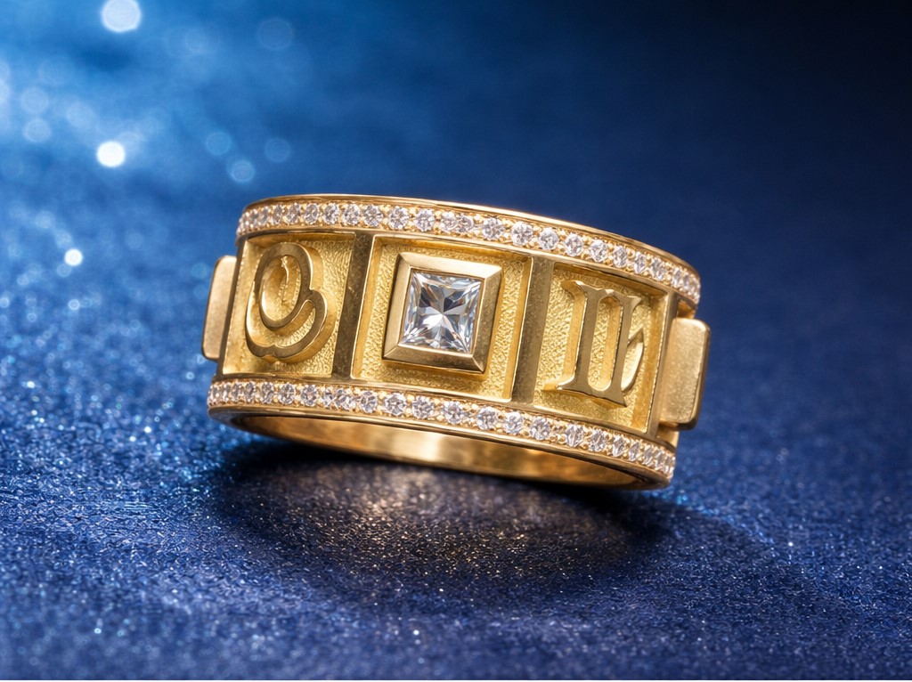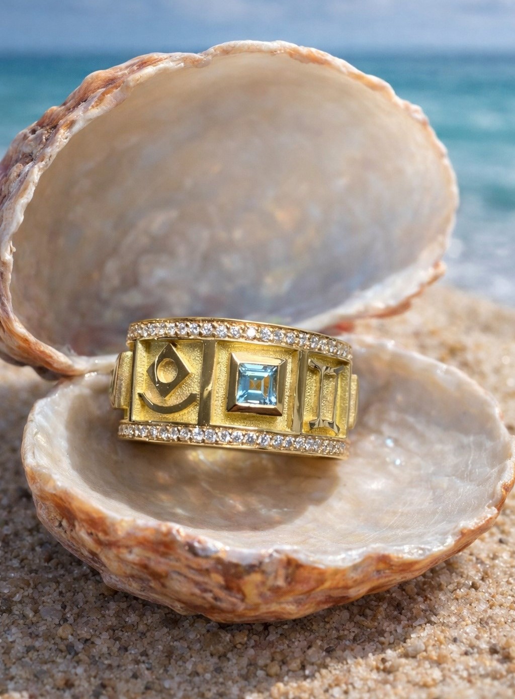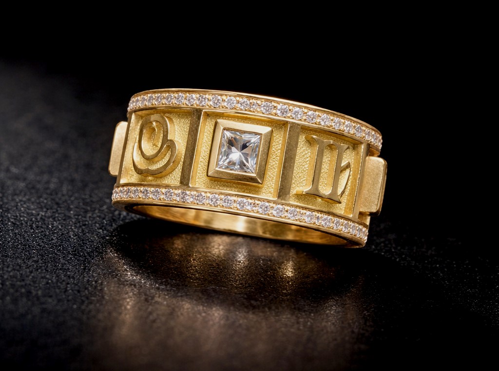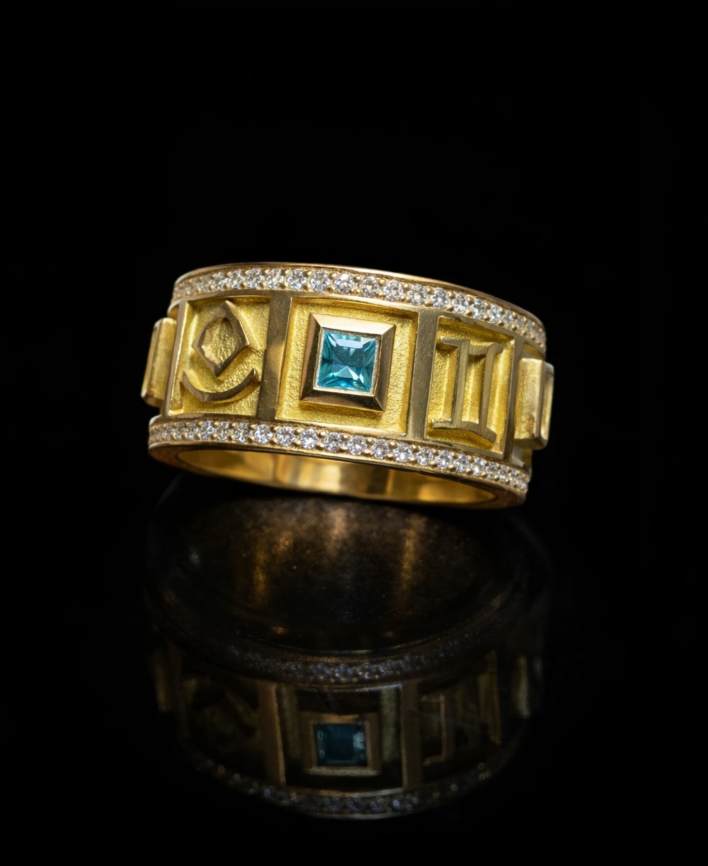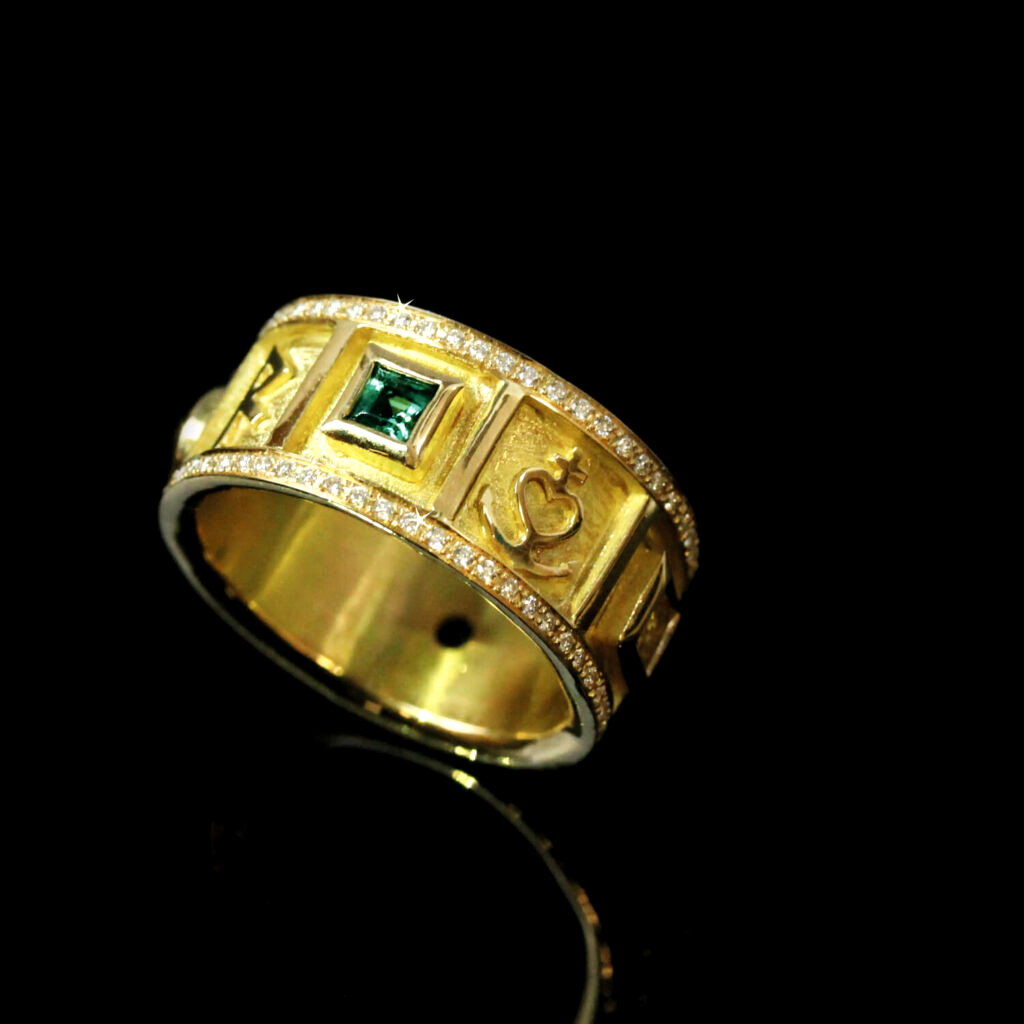 Die Gravuren, Symbole und Edelsteine werden auf Grundlage Ihres persönlichen Horoskops ausgewählt und nach einer festen, kunstvollen Ordnung im Ring angelegt.