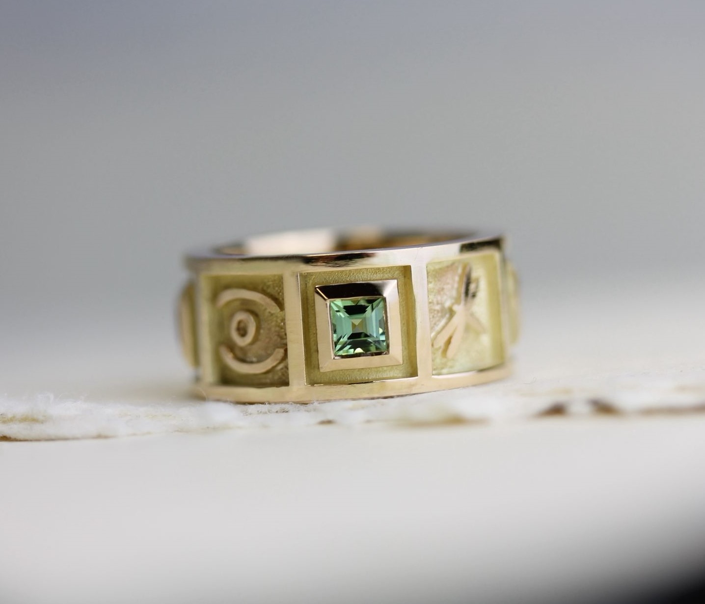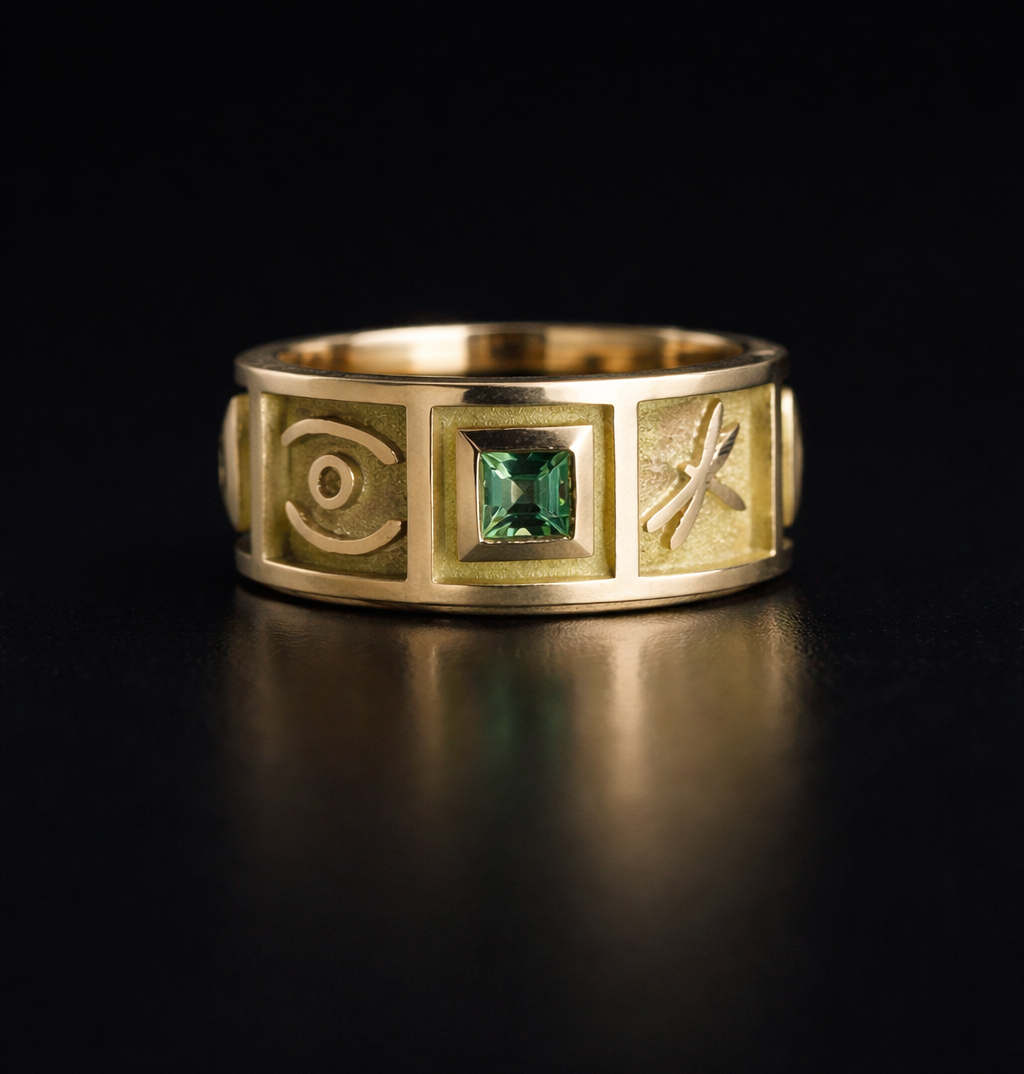 Die Gravuren, Symbole und Edelsteine werden auf Grundlage Ihres persönlichen Horoskops ausgewählt und nach einer festen, kunstvollen Ordnung im Ring angelegt.