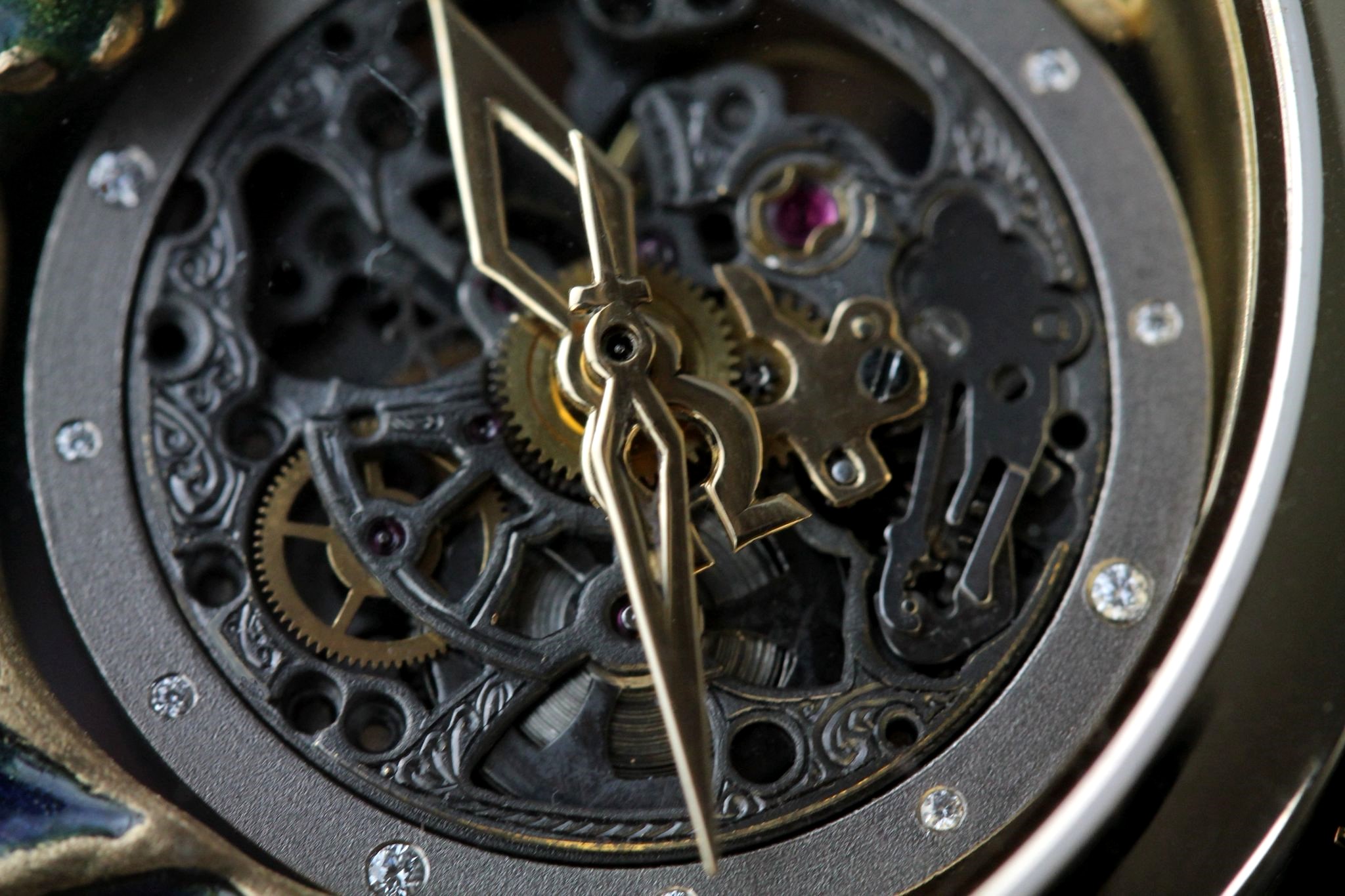 Die Schwungmasse besteht aus 750er Gold, lupenreinen Brillanten und Emaille.